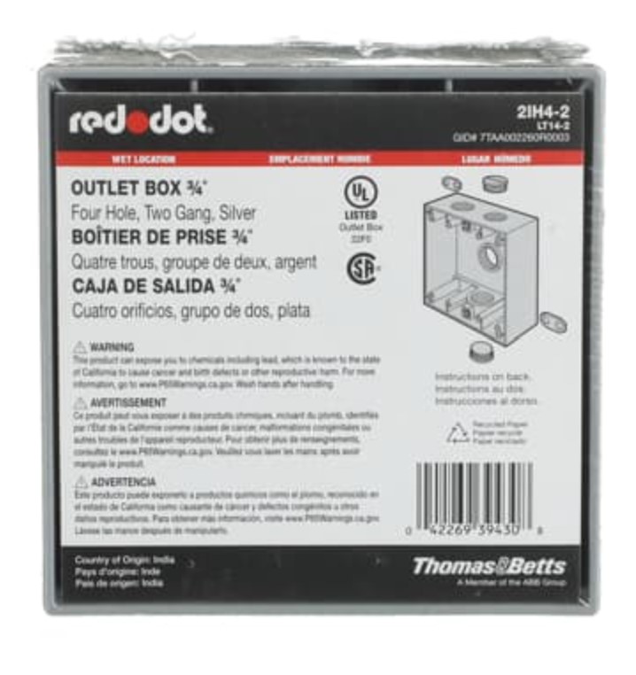 RED DOT Weatherproof Box, 2 Gang, (4) 3/4″ Outlets, 2-1/16″ Deep, Aluminum Die Cast