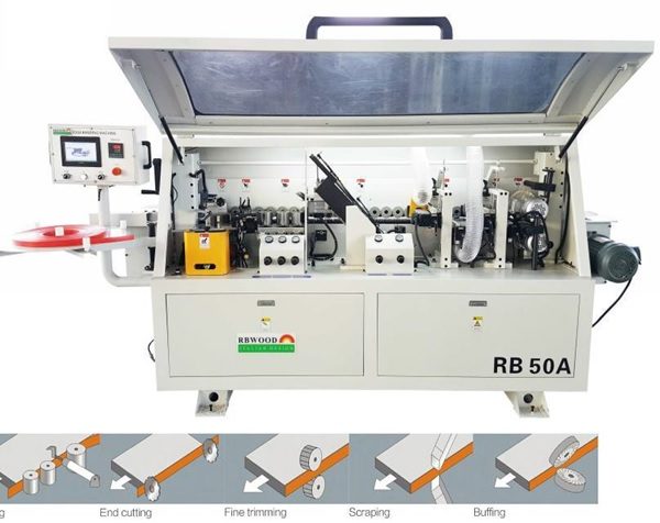 Edge thickness 0.4~3mm Feed speed 18m/min Panel thickness 9~50mm Panel length ?140mm Panel width ?50mm Glue motor power 0.37kw Glue tank heating power 1.5kw End cutting motor power 0.55 kw*2 @18000rpm Fine trimming motor power 0.75 kw*2 @ 18000rpm Buffing motor power 0.18 kw*2 @ 1400rpm Total motor power 7.0 kw Working pressure 0.7Mpa Extended support 550mm Outline size 2950*750*1360mm
